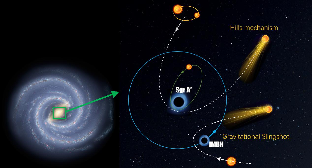 Figure 1: A schematic diagram (right) for the two mechanisms of producing hypervelocity stars at the center of the Milky Way (left). One mechanism involves a binary star being separated by the tidal force of the supermassive black hole Sgr A* followed by the ejection of one star at an extremely high velocity (Hills mechanism). The other mechanism involves a single star interacting with an intermediate-mass black hole (IMBH) orbiting Sgr A*, gaining high velocity through the gravitational slingshot effect. (Image of the Milky Way: NASA/JPL-Caltech.)