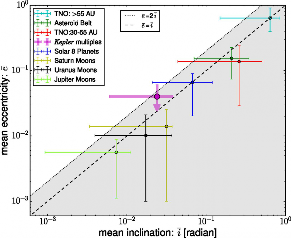 Figure 2 (from the published PNAS paper). The mean eccentricity (e) and inclination (i) of Kepler multiples fit into the pattern of the solar system objects satisfying a relation e ≈ (1-2) x i. The dots represent the Kepler multiple planets (magenta), the 8 planets of the solar system (blue), regular moons of Jupiter, Saturn, and Uranus (light green, yellow, and black); main belt asteroids (green); and trans-Neptune objects (TNOs; both the classical Kuiper Belt objects with orbital semi-major axes 30–55 AU shown in red and the scattered disk objects with semi-major axes >55 AU shown in cyan).