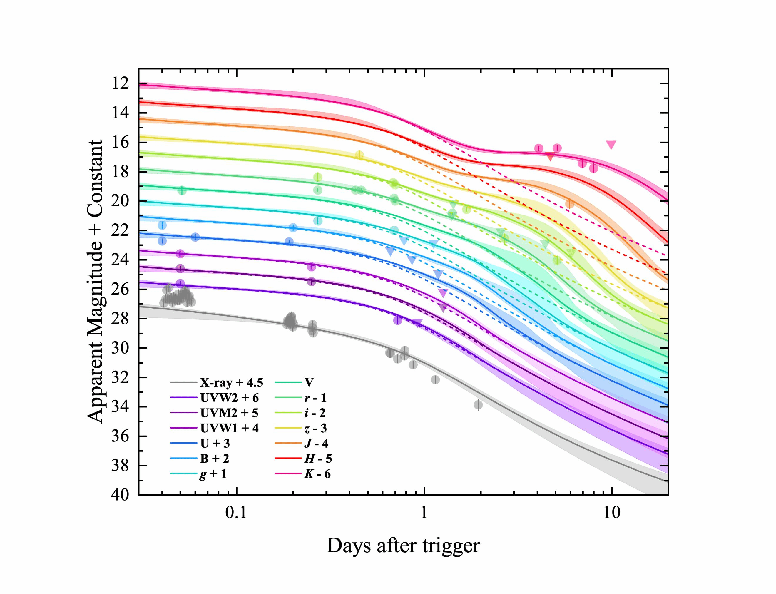 By systematically studying the properties of these three gamma-ray bursts, Zhu and coauthors found evidence that they occurred because of the merger of a black hole-neutron star binary. First, the early gamma-ray and X-ray extended emissions of all these bursts contained clear fallback accretion signals, consistent with the fallback accretion emissions which are predicted to occur after black hole-neutron star mergers (see Figure 1), resulting in the extension of the burst activity duration. Secondly, the ejecta mass inferred from kilonova candidates of these long-duration gamma-ray bursts could be even as large as 0.1 solar mass (see Figure 2 for the fitting results of the GRB211211A-associated kilonova candidate). In numerical simulations, only extremely high-spinning black hole-neutron star mergers can finally eject materials with such a large mass. Moreover, based on the detection rate of the three events, the estimated event rate densities of long-duration gamma-ray bursts of this kind agree with the predicted rate densities of cosmological fast-spinning black hole-neutron star mergers. Thus, black hole-neutron star mergers can well explain the origins of GRB211211A-like long-duration gamma-ray bursts.