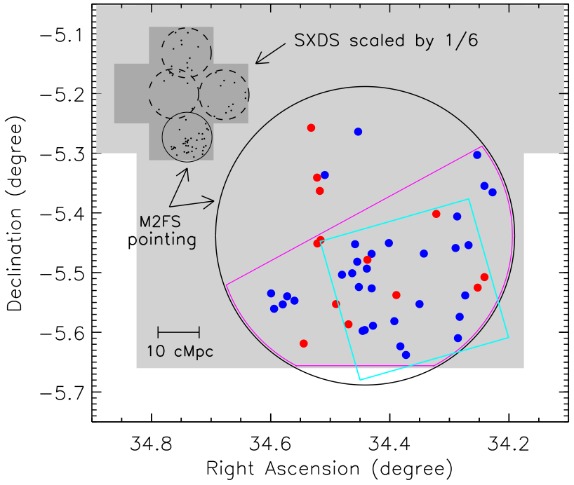 Figure 2: Schematic representation of the SXDS_gPC region. The blue and red solid points represent spectroscopically confirmed, luminous LAEs. The cyan rectangle represents the giant protocluster SXDS_gPC, which is embedded in the large overdense region outlined by the magenta, half-circle-like shape.