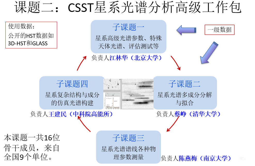 本课题名称为“CSST星系光谱分析高级工作包”,课题级别为一类课题,所属领域为星系与活动星系核。课题名称中的“星系”包括活动星系核(注:星系广义上包括活动星系核)。该课题的主要目的是针对CSST极具特色和挑战的无缝光谱,为研究星系和活动星系核提供分析方法、软件和工具等。