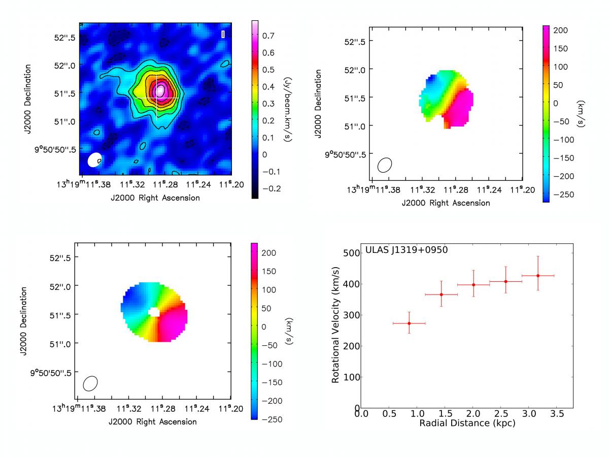 TOP LEFT: The [C II] velocity integrated map which presents a source size of 3.57 X 2.94 kpc. TOP RIGHT: The observed velocity field. An clear velocity gradient is obvious. BOTTOM LEFT: The tilted ring model. BOTTOM RIGHT: The rotation curve.