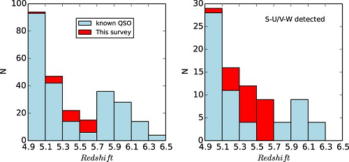 Figure 2. Left: The distribution of all previously known quasars (blue) and newly discovered quasars (red) at redshift z > 4.9 with z band magnitude brighter than 20.5. Right: The distribution of newly discovered quasars compared with all SDSS-ULAS/VHS-WISE detected known quasars.