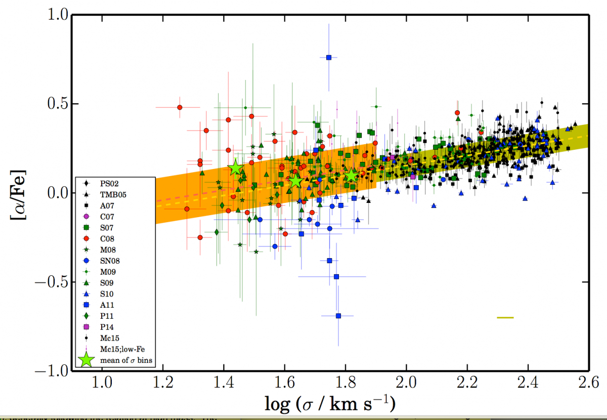 Figure 1: Relation between [alpha/Fe] derived from single stellar population models and sigma of ETGs. Different colours and symbols represent different subsamples, and the references are listed in the legend. The galaxies in the sample are divided into two groups by log(sigma) = 1.9. The green stars in the low-mass range show the weighted mean of three bins of sigma, which are log(sigma) = 1.2-1.5, 1.5-1.7, and 1.7-1.9. The yellow dashed line and band display the relation and intrinsic scatter fitted by the high-sigma group, and the ones fitted by the low-sigma group are displayed in orange.