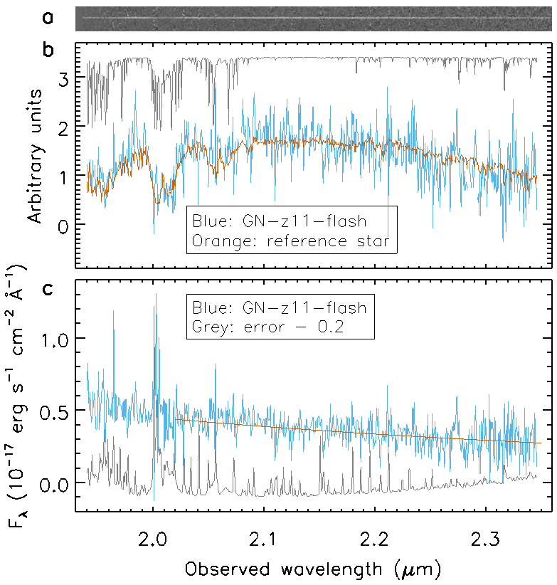 Figure 3. Spectra of the burst GN-z11-flash. Panel (a) shows its 2D spectrum, panel (b) the 1D spectrum (blue) extracted from (a), and panel (c) the fully calibrated spectrum (blue).