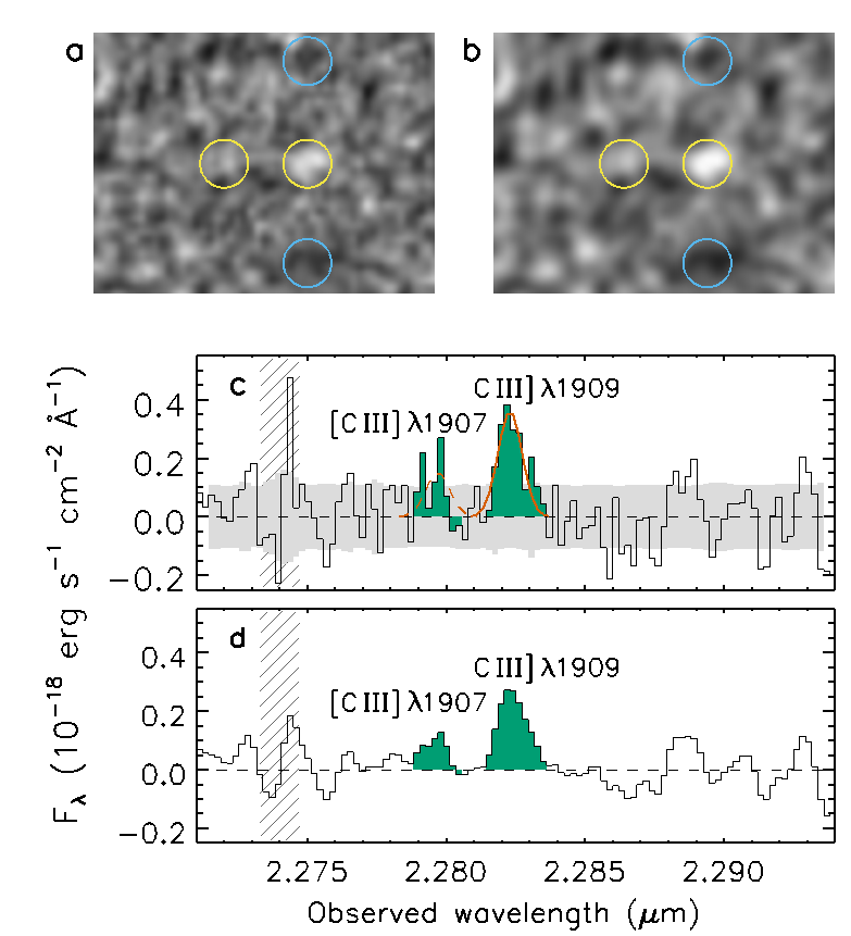 Figure 2. Keck near-infrared spectra of GN-z11. Panels (a) and (c) show the 2D and 1D spectra, respectively; panels (b) and (d) show the smoothed version of the 2D and 1D spectra. The doubly ionized carbon emission lines at rest-frame ~191 nm have shifted to about 2283 nm in the observed frame, indicating a redshift 10.957.