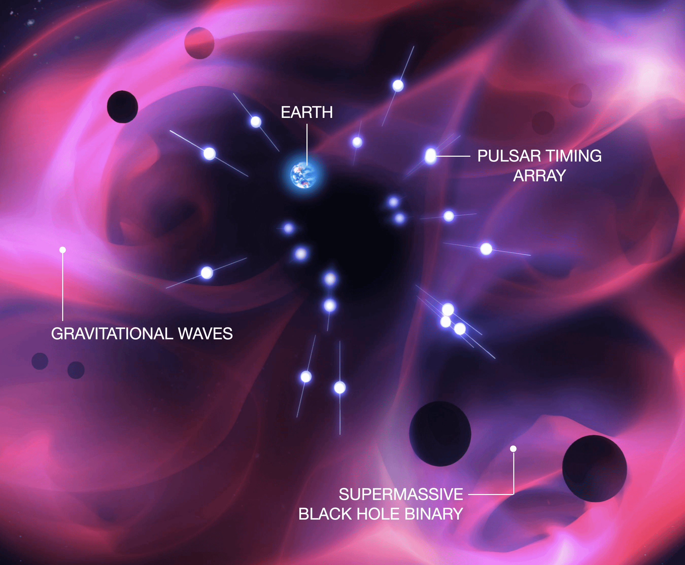 This search includes an extensive comparison between individual data sets from the large regional scientific collaborations and the combined data set. The GW search of the IPTA DR2 has revealed strong evidence for a low-frequency signal detected by many of the pulsars in the combined data. The characteristics of this common-among-pulsars signal are in broad agreement with those expected from a GW “background” (GWB). This background is formed by many different overlapping GW signals emitted from the cosmic population of supermassive binary black holes (i.e., two supermassive black holes orbiting each other and eventually merging), analogous to background noise from the many overlapping voices in a crowded hall. This result further strengthens the gradual emergence of similar signals that have been found in the individual data sets of the participating collaborations over the past few years.