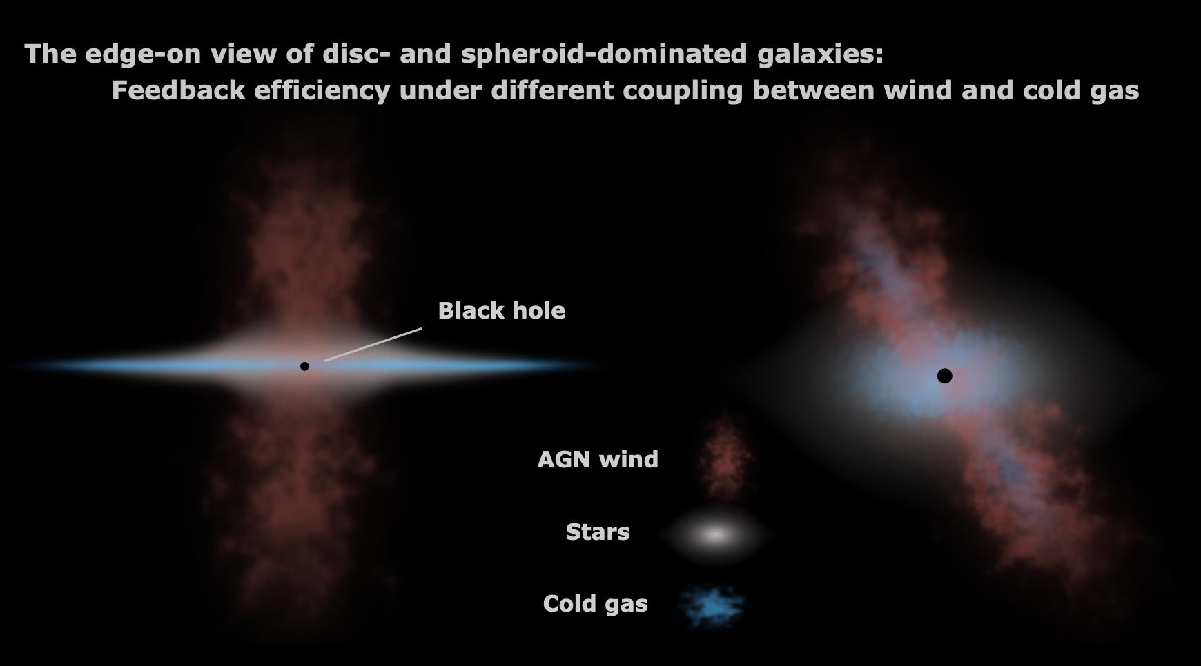 Fig 2: The preventive feedback mode in fast-rotating (left) and ejective mode in slow-rotating (right) galaxies. A fast-rotating disc galaxy without much gravitational interference has its cold gas settled in a planar form and the biconical wind launched by the central black hole then has little surface of impact to drive massive gas outflows. While a slow-rotating spheroidal galaxy, which must have experienced significant mergers over time, tends to possess volume filling gas in hotter kinematics and therefore its gas couples well with the wind for outflows to be driven.